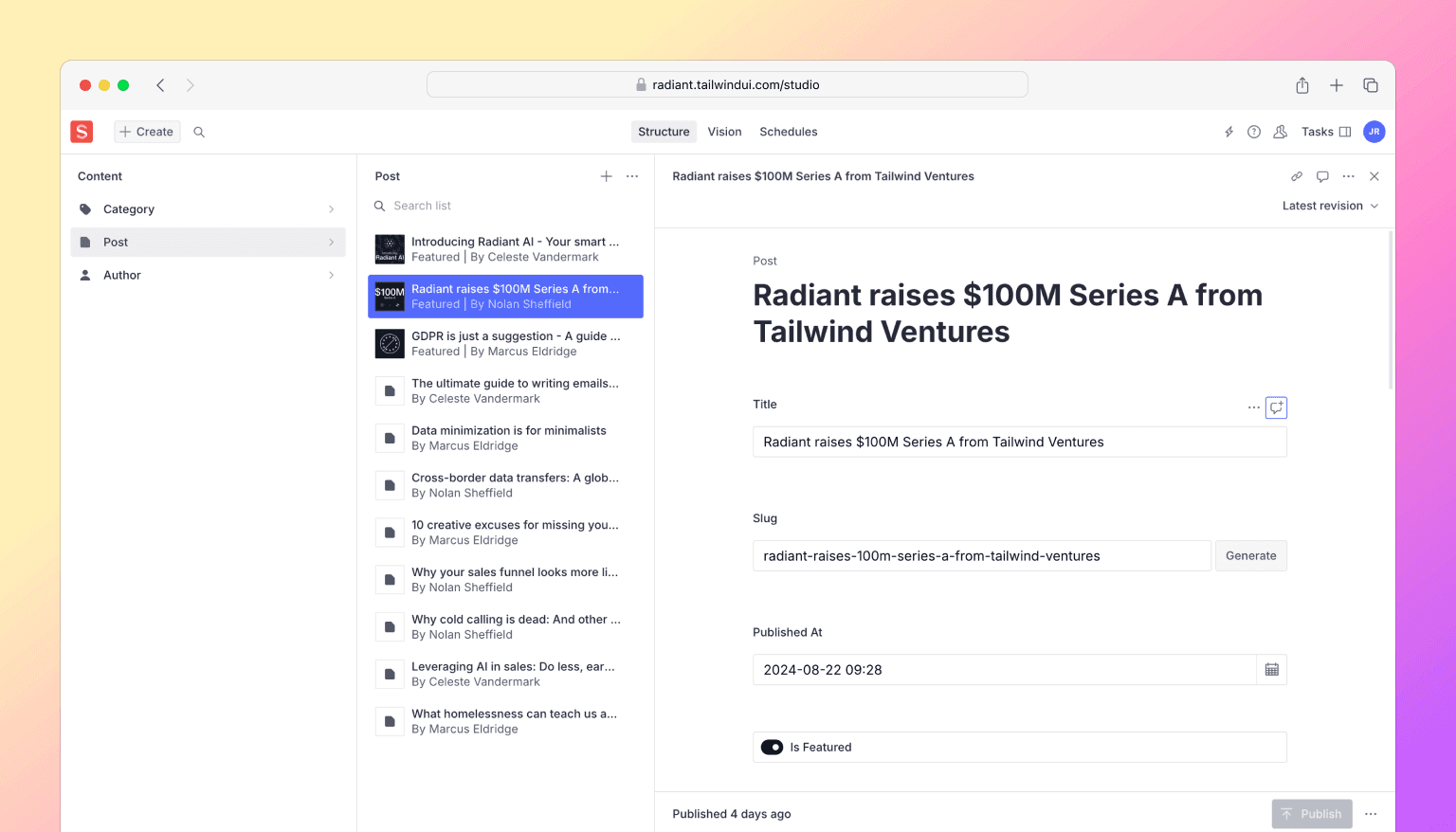 <div className="text-sm/5 max-sm:text-gray-700 sm:font-medium"> {dayjs(post.publishedAt).format('dddd, MMMM D, YYYY')}</div>{post.author && ( <div className="mt-2.5 flex items-center gap-3"> {post.author.image && ( <img className="aspect-square size-6 rounded-full object-cover" src={image(post.author.image).width(64).height(64).url()} alt="" /> )} <div className="text-sm/5 text-gray-700"> {post.author.name} </div> </div>)}Like you might do with front matter in Markdown, you can also enrich content with custom fields. For example, we added a featured boolean field to the blog post schema so you can highlight some posts in a special section on the blog.